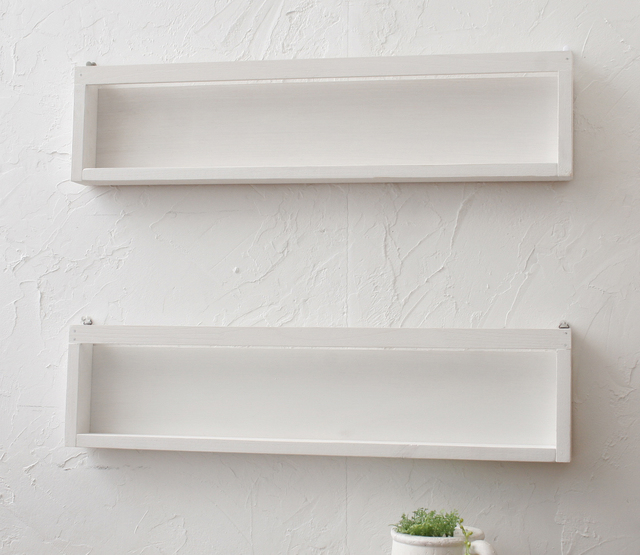 ★取り付けは上部2か所に三角金具がついています。ご家庭の壁にあった釘・ビスなどで固定してください。写真は画鋲でとめていますが、複数の本を入れると重量が増すのでしっかりと固定することをおすすめします。