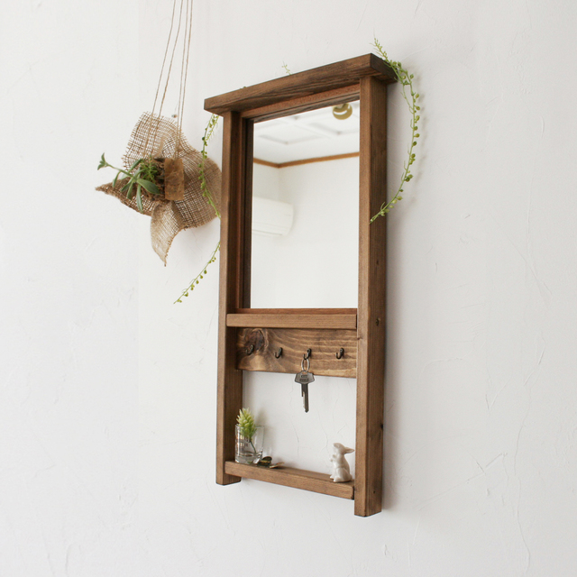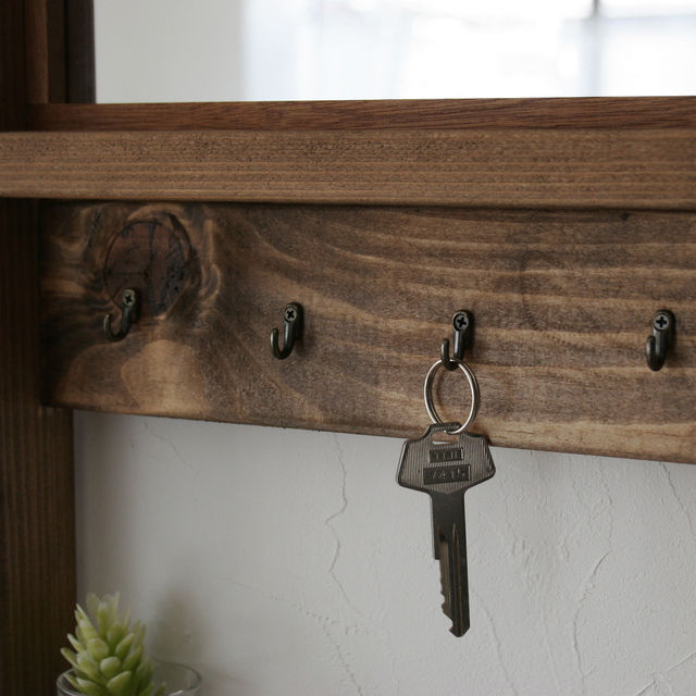 洗面所でちゃんと準備したつもりでも、玄関先で最終チェックしてみたらヘアスタイルが乱れていた・・なんてことありませんか?場所がなくてもチョイ置きできる薄型ミラーにキーフックが4個ついています。ご家族それぞれの鍵置き場にしたり、おうちの鍵、車の鍵、自転車の鍵・・と分けて使っていただけます。