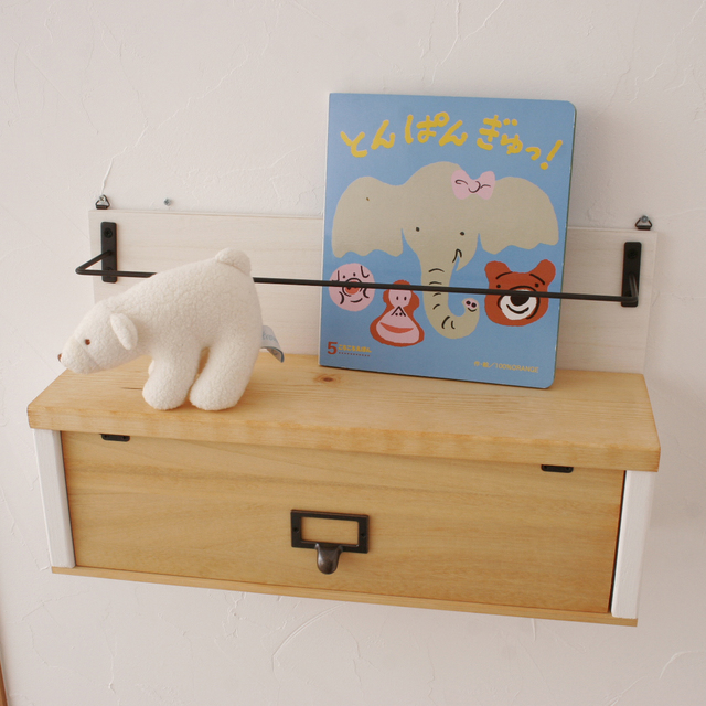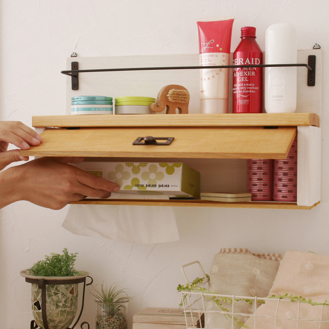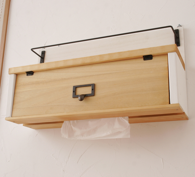 ティッシュケースがすっぽり入る壁掛け収納棚です。