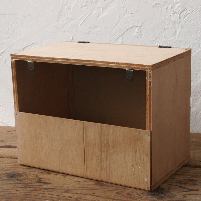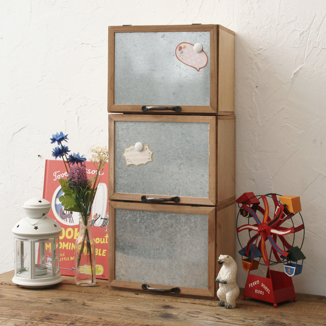 扉はブリキ板になっており(磁石もくっつきます)、本体にはナチュラルカラー(うすい茶色)のステイン塗装で木目を残していますのでちょっとレトロな雰囲気です。